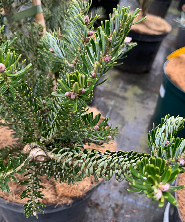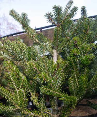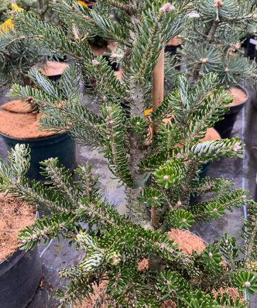 Abies koreana ‘Silberlocke’ is a slow growing compact conifer. Upright growth, with upward curling silvery blue foliage. Attractive violet purple cones produced from a young age. Growth rate 3.5ft (1.10m) in 10 years. Well drained fertile soil in sun.