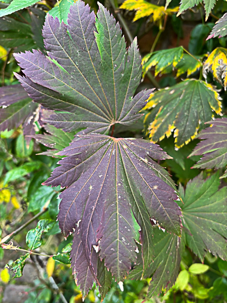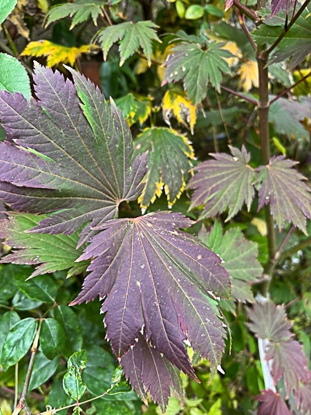 A distinct variety of Full Moon maple. Its leaves emerge black-red, brighten to red in late spring and soften to bronzy green with darker edges in mid to late summer. It gives a spectacular display of oranges, reds and purple in the autumn. Ht 8ft in 10 years. Acid soil. Part shade.