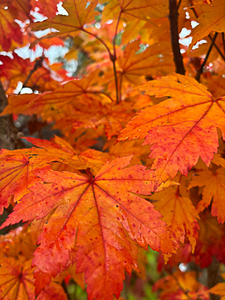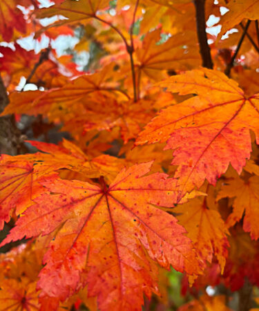 Acer japonicum ‘Vitifolium’ is a vigorous, deciduous, bushy tree or shrub, with large, rounded, lobed mid-green leaves that turn brilliant red, orange and purple in autumn. Ht 15-20ft (4.5-6m). Requires full sun and well drained soil.