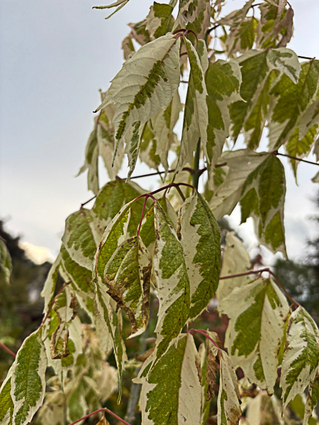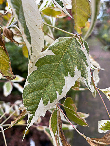 Acer negundo is a striking bushy shrub, eventually maturing to a small tree. Young foliage light pink leaves with white variegation, turning yellow in the Autumn. Best variegation is displayed on plants that are regularly pruned. Ht 10-15ft (3-4.5m).
