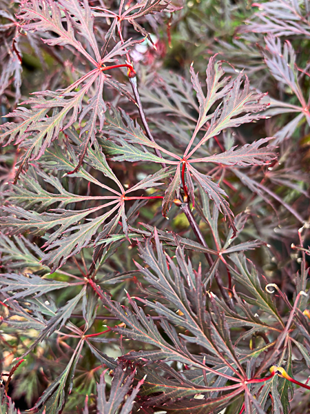 Acer palm. diss. ‘Garnet’ A strong growing dwarf tree. Forming a dense dome shaped rounded shrub. Finely dissected deep crimson leaves. Leaves colouring ruby red in autumn. Ht 4-5ft, spread 4-5ft. (120-150cm). AGM. Good pot specimen. Moist peaty soil, shaded site.