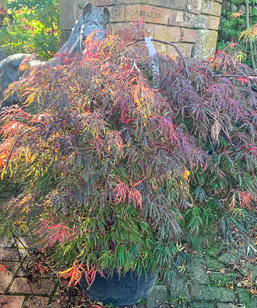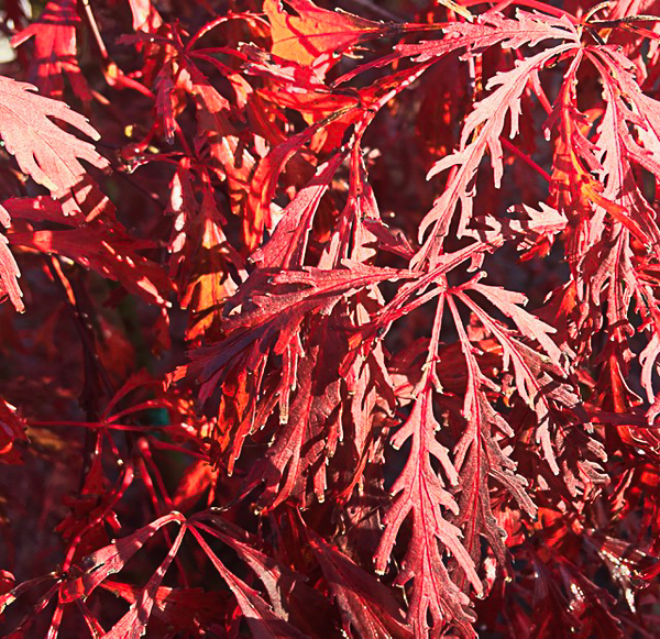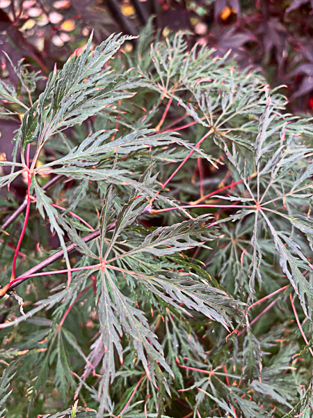 Acer palmatum dissectum is a low mounding dome. Filigree dissected deep purple foliage. Silvery- green /purple colour in shade. Rich crimson autumn tints. Slow growing spreading form. Ht 4-6ft (120-180cm). AGM. Peaty soil, shelter from east winds.