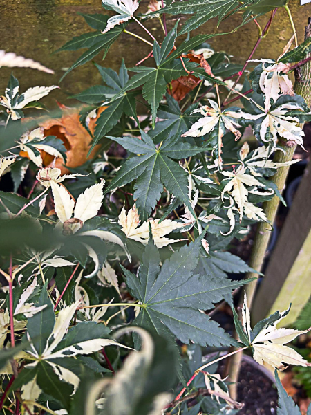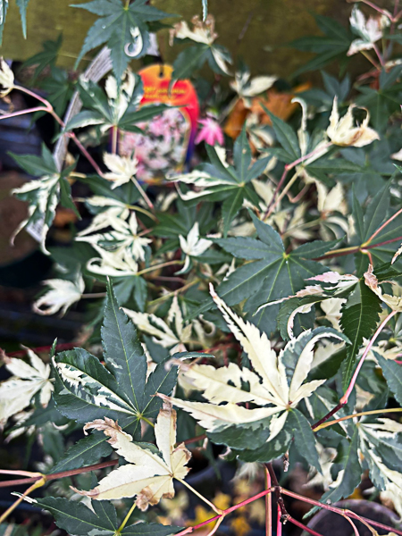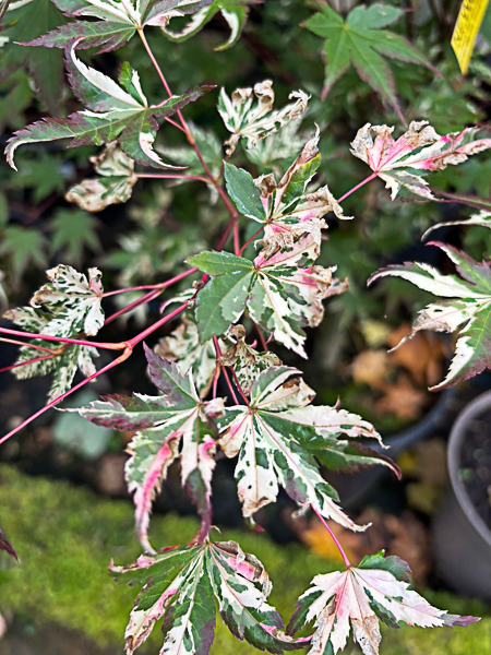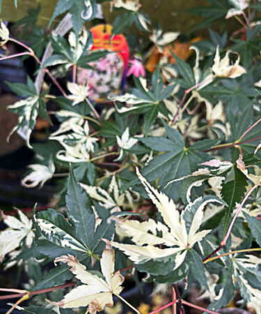 Acer palmatum Ashahi-Zuru’ is an attractive small tree, low rounded umbrella shaped head. Leaves splashed white and pink. One of the best variegated forms. Rich red autumn colouring. Ht 10-12ft (3-3.5m). Acid soil, sun or part shade.