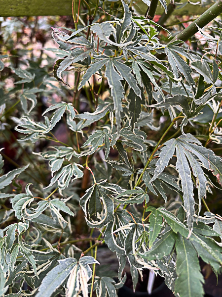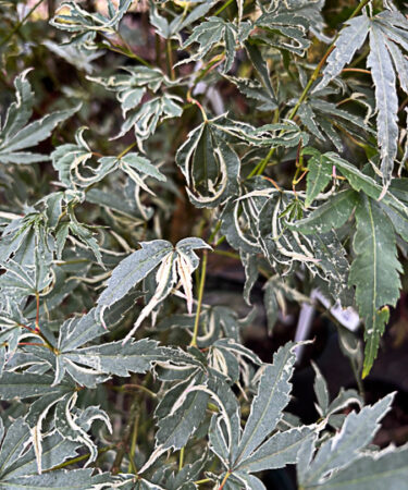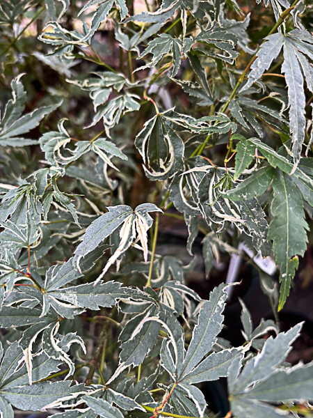 Lovely dwarf vase shaped tree. Fine delicate branches. Beautifully variegated pink,red and green palmate foliage. Ht 5ft (150cm), spread 3-4ft (90-120cm). Well drained moist peaty soil, shelter.