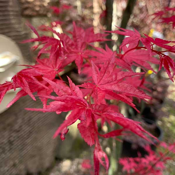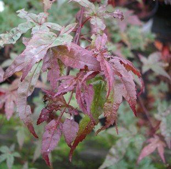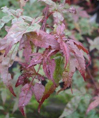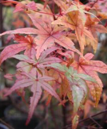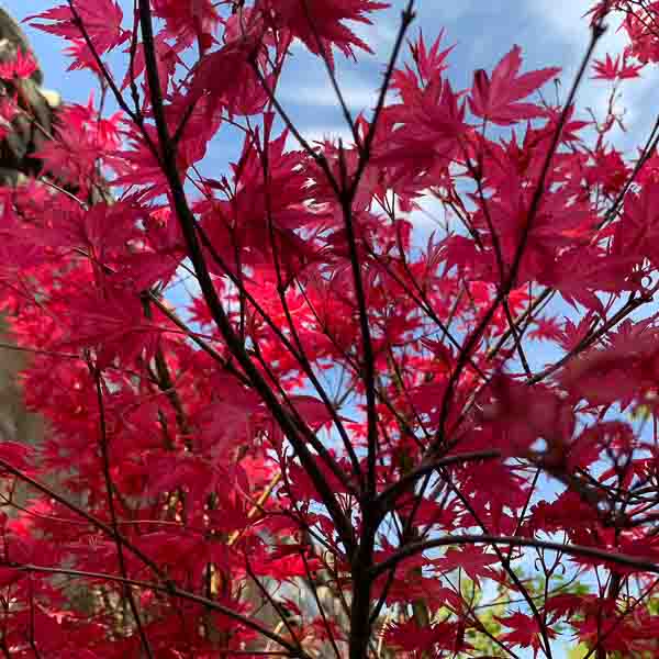 Acer palmatum ‘Deshojo’ is a lovely unusual variety of Japanese maple. An elegant small umbrella shaped tree. Brilliant red leaves when unfolding later turning dark pink then to green and scarlet in autumn. Ht 6-8ft (180-240cm). Moist well drained peaty soil, part shade.