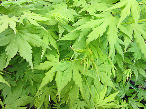 Acer palmatum ‘Going Green’ is a compact variety with clear green luminous spring foliage turning orange yellow in autumn. Ht and Spr approx 1m (3ft). Acid to neautral soil.