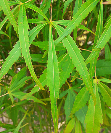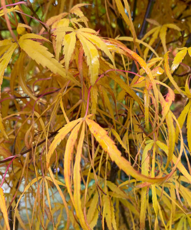 Acer palmatum ‘Koto No Ito’ is a large, slow growing shrub. Ht 8-10ft. Fresh green, finely dissected foliage. Good bronze/golden autumn colouring. Suitable for pot culture. Acid soil. Part shade. Ht 8-10ft (2.4-3.0m).