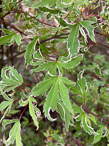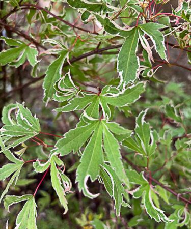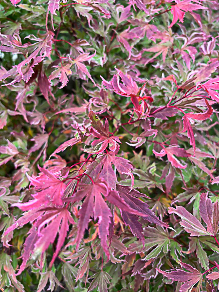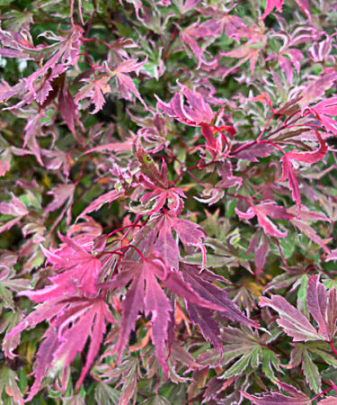 A compact, deciduous shrubby Japanese Maple with deeply-cut, five- or seven-lobed leaves that emerge yellow in spring with a reddish-pink edge maturing to light green with a pale pink edge to mid-green with a white edge as summer progresses. The foliage turns orange-red in late summer before finally turning red-violet in autumn. Ht expected 2-3m (new variety so known). Sun/ part shade. Well drained neutral to acid soil.