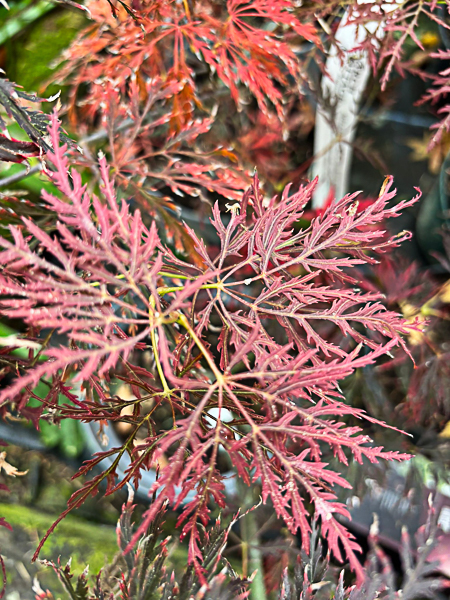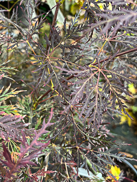 A new introduction of Japanese maple with dissected, purplish red leaves turning reddish orange in autumn. Semi upright habit. Ht 2.5 m in 10 years. Acid to neutral soil. Well drained site, sun or part shade.