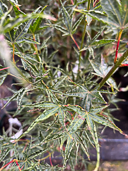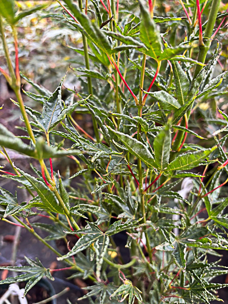 Acer palmatum ‘Okushimo’ is an unusual, curious form. Dark green leaves with pointed lobes turning orange, yellow and red in the autumn. Vase shaped habit. Ht 6-8ft (180-240cm). Good for pot culture. Acid soil. Sun or part shade.