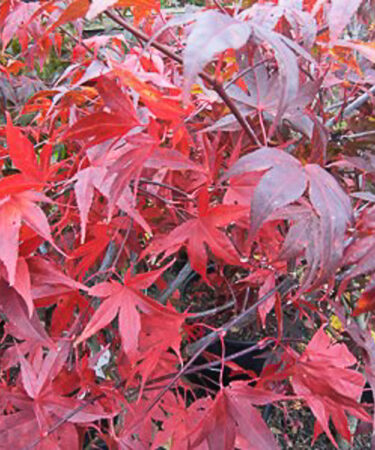 Acer palmatum ‘Osakazuki’ is a deciduous, bushy headed shrub or small tree. Large deep green palmate foliage. Turning fiery red in autumn. AGM. Ht and spread 10ft (3.0m). Fully hardy. Peaty soil, sun or part shade.