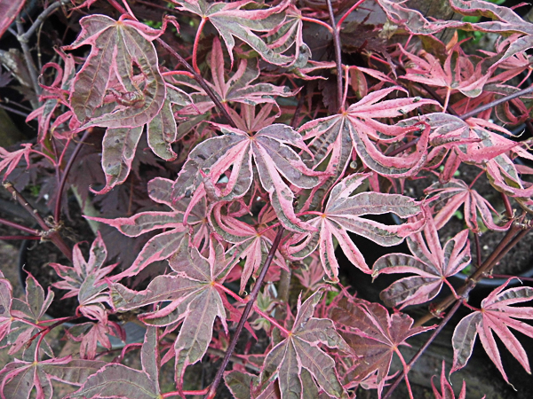 Acer palmatum ‘Shirazz’ is a new and exciting Japanese Maple with multi-coloured leaves ranging from pinks, greens, and creamy-white. New growth emerges with hues of striking crimson-pink with white margins. Crimson red to scarlet autumn colour. Upright at first, becoming gracefully arching. The plant offers heat resistant foliage and striking variegation. Ht 10-15ft (3-4.5m)