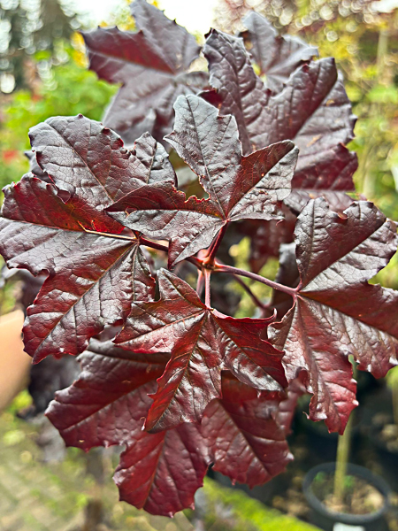 Acer platanoides ‘Crimson King’ is a large, handsome, vigorous tree. Deep crimson purple leaves, turning orange in autumn. Small yellow flowers are tinged red, April. Tolerates semi-shade. AGM 2002. Ht 30ft (9m)