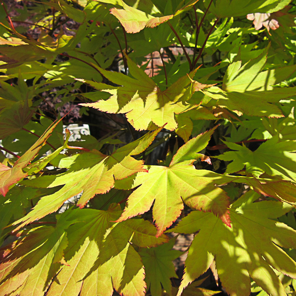Acer shirasawanum ‘Autumn Moon’ is similar to ‘aureum’ but with golden yellow leaves flushed orange. Lovely slow growing maple. Forming a striking rounded shrub of pleated round lobed yellow foliage. Sun/part shade, well drained soil. Ht 8-10ft (2.4-3m).