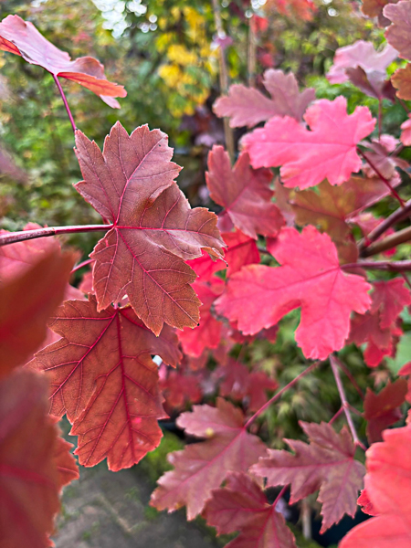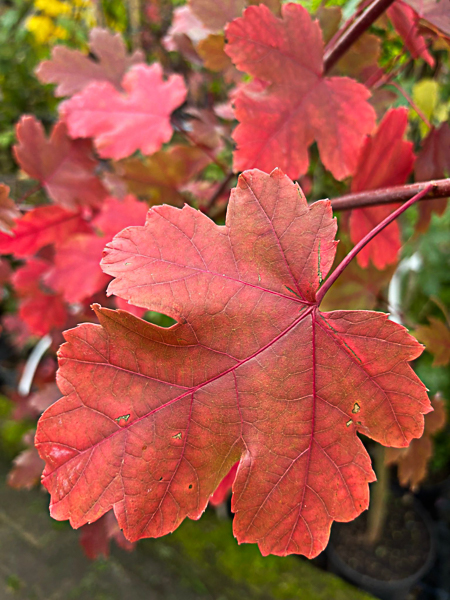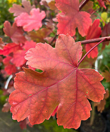 Acer X freemanii ‘Autumn Blaze’ is a handsome, vigorous tree forming an oval shaped head. Green leaves with a silvery underside and clear-red veins that turn spectacular shades of glowing crimson-red and orange in autumn. Ht 15-20ft (4-6m) in 10 years. Sun/ part shade. Best autumn colour on acid soils.