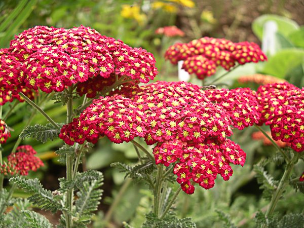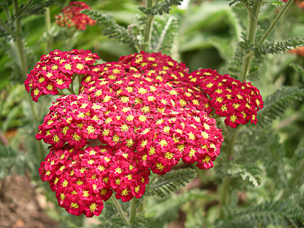 Achillea millefolium ‘Pomegranate’ is a compact, bushy strain. Ferny foliage. Clusters of rich pomegranate red flws, holding the colour well. Excellent for cutting. Flws: Jun-Sept. Ht 2ft (60cm). Any well drained garden soil. Sunny position. Dead heading faded blooms should encourage more buds to form over a long season.