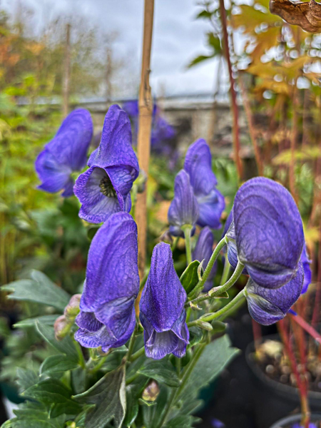 Aconitum carmichaelii ‘Barker’s variety’ is also known as ‘Monkshood’. Large pure violet blue flws in long racemes. Flws: Jun-Oct. Ht 5-6ft. Moist soil. Part shade. Poisonous.