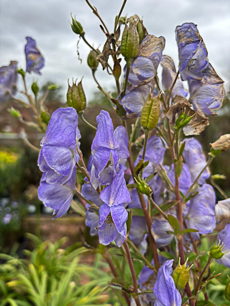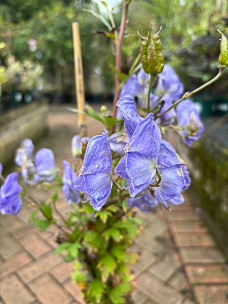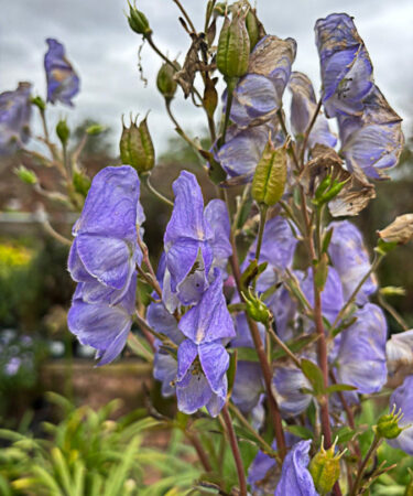 Aconitum carmichaelii ‘Spatlese’ is a large imposing architectural plant. Tall erect stems of light azure blue hooded flws. Flws: Aug-Oct. Ht 5ft. Poisonous. Moist soil. Part shade.