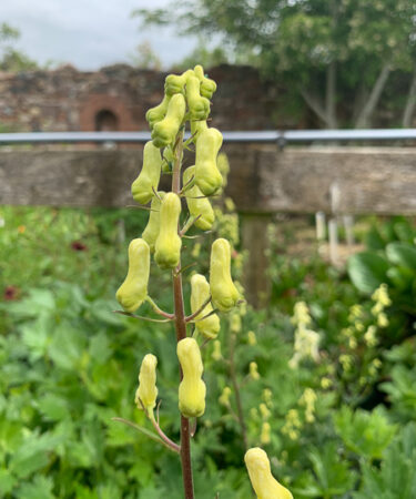 Aconitum ‘Ivorine’ has glossy dark green rounded lobed foliage, short dense spires of hooded creamy white flowers produced July/Aug. Ht 2-3ft. Moist retentive soil, sun /part shade. Poisonous.