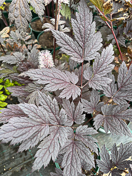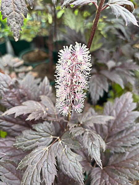 Carbonella is a new Actaea for the smaller garden. Similar to ‘Brunette’ but shorter. Clumps of very dark foliage accentuated by the beautifully scented white/ pale pink bottle brush flowers Aug – Oct. Prefers moist soil in part shade. Ht 90-120cm (3-4ft).