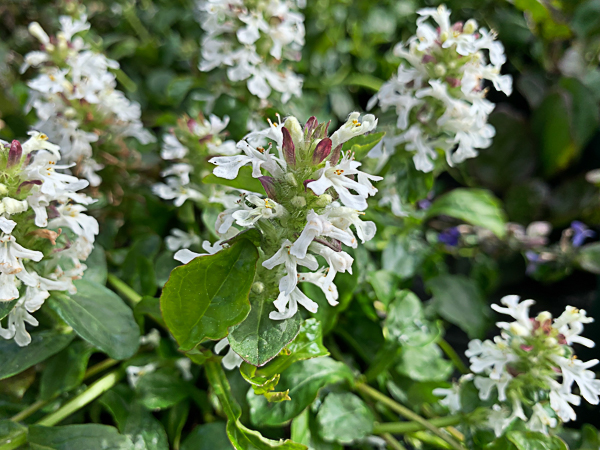 Ajuga reptans f. albiflora ‘Alba’ A good dense ground covering plant. Glossy, deep green foliage. Short, showy spikes of creamy-white flws. Flws: May-Jul. Ht 6″. Any reasonable garden soil. Sun/ part shade.