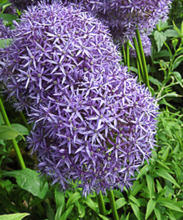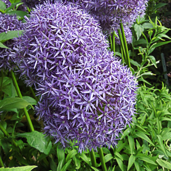 Allium ‘Globemaster’ is a spectacular new hybrid. Large spherical heads of aster-violet colured flws. Flws: June. Ht 70-80cm. Well drained soil. Sunny position. AGM