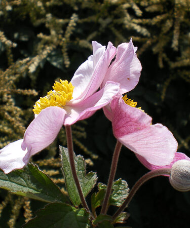Clumps of lobed leaves with white woolly undersides. Palest pink anemone flws with golden centres. Ht 3-4ft. Moist, fertile, well-drained soil that is rich with organic matter. Sun/ part shade.