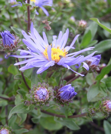 Aster amell. ‘King George’ AGM Clumps of upright leafy stems, narrow deep green foliage,large open clusters deep indigo violet daisy flws Aug/Sept Ht 1.5ft. Fertile well drained soil, sunny position