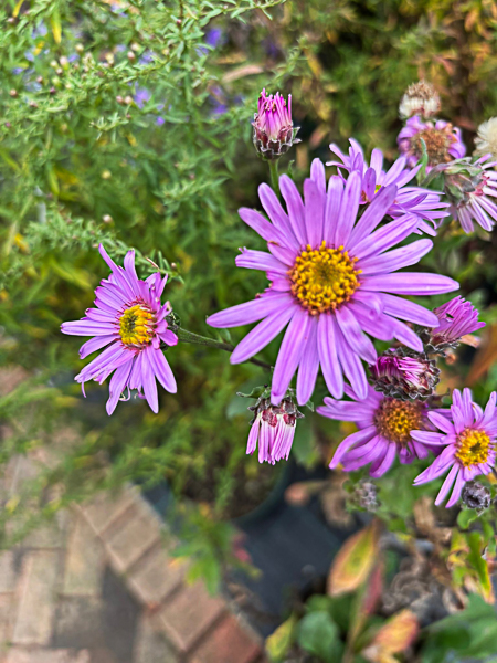 Aster amell. ‘Pink Zenith’ (Rosa Erfullung) Clumps of upright leafy stems. Narrow deep green foliage. Large open clusters of good clear pink daisy flws. Flws: Aug/Sept. Ht 2ft. Fertile well drained soil, sunny position.