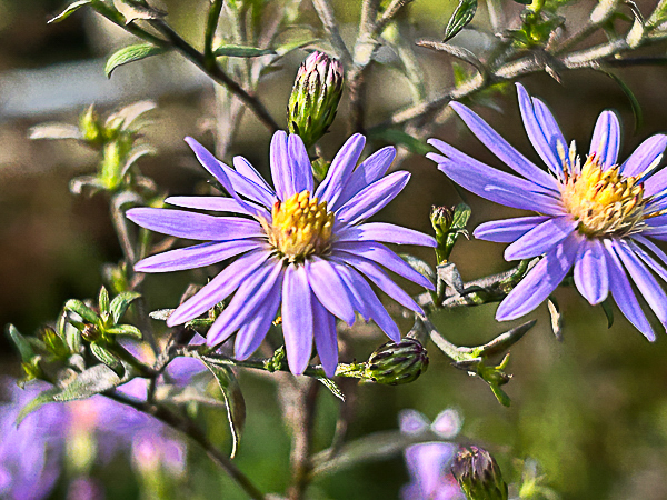 (Symphyotrichum) Perennial with dense, arching stems. Graceful sprays of lavender /mauve flws. Flws: Aug/Oct. Ht 2-3ft. Full sun. Well-drained soil.