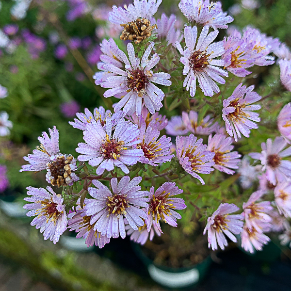 (Symphyotrichum) Long, pointed, spikes of small, soft pink-lilac, daisy-shaped flowers, which fade as they age, arch forward on stiff, well-branched stems, autumn. The leaves are small and mid-green leaves. Ht 3-4ft. It requires no staking.Well drained fertile soil. Sun.