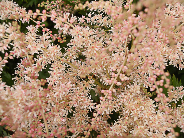 White cultivar of ‘sprite’. White plumes of starry flowers. Clumps of bronzed ferny foliage . Flws: Jul-Aug. Ht 18″. Moist conditions, affective at pool edges.