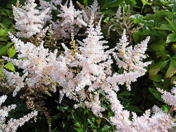 Pale shell pink plumes of starry flowers. Clumps of bronzed ferny foliage . Flws: Aug-Sept. Ht 18″. AGM. Moist conditions, affective at pool edges.