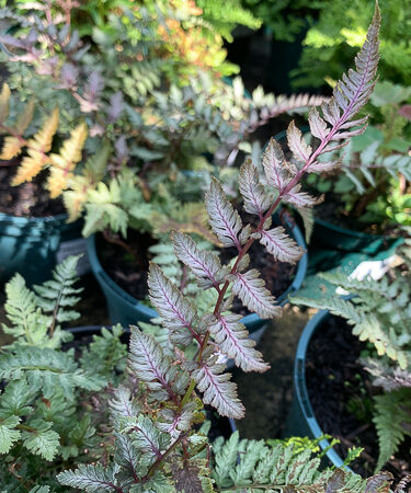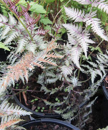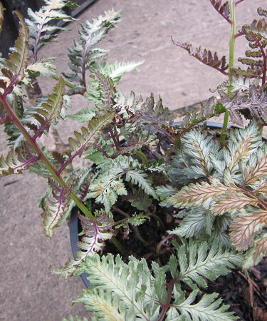 This selected form of Japanese Painted Fern has arching triangular leaves of metallic pewter-grey with mint-green edges and coral-red veins. It forms a small lacy mound that looks particularly good edging a woodland walkway, in shady borders or even in containers. Deciduous. Leaves may be trimmed to the ground in late fall or early spring. Well-behaved, non-spreading habit.