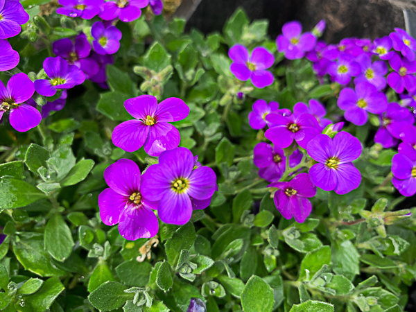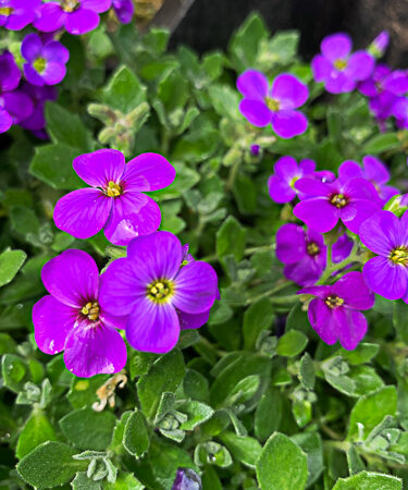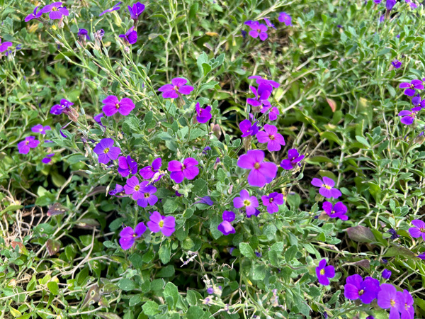 Low mats of spreading grey green foliage covered in lavender blue flowers Mar-Jun. Ht 4″ Spread 12″. Well drained soil, rockery, wall, sun.