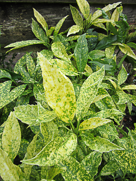 Similar to ‘crotonifolia’ but with more striking variegation. Evergreen, bushy, dense shrub. Stout, green shoots. Large glossy, dark green leaves, heavily mottled yellow. Small, purplish flws, May. Followed by bright red berries. Male. Ht 5-6ft. Any reasonable soil. Best in part shade.