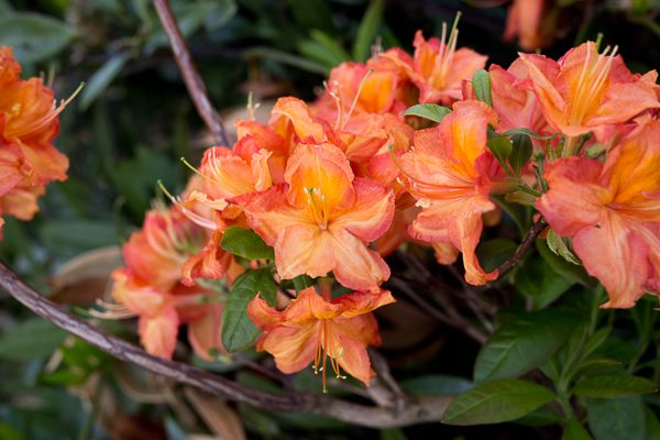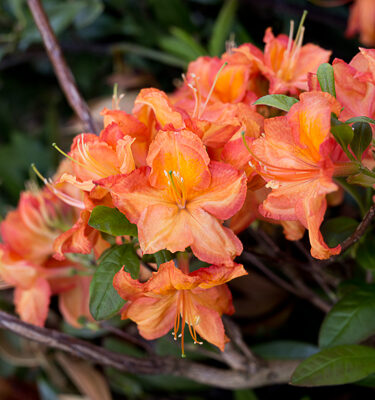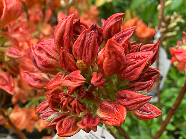A deciduous azalea of open habit, grey green foliage colouring richly in autumn. Producing clusters of brilliant fiery- red trumpets. May-Jun.Ht 5ft