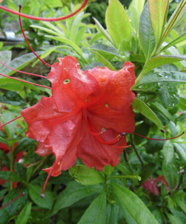 A deciduous azalea of open habit, grey green foliage colouring richly in autumn. Producing clusters of brilliant fiery- red trumpets. May-Jun.Ht 5ft