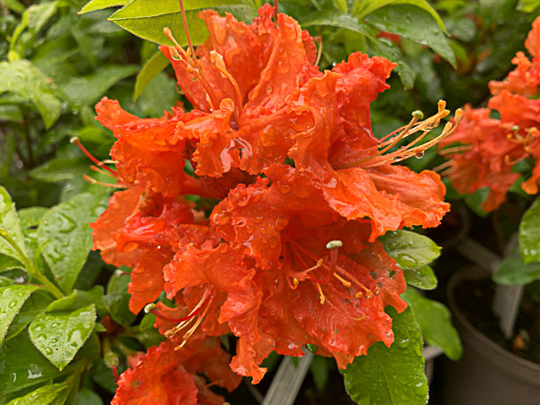 A striking Knaphill deciduous azalea, attractive grey green foliage, colouring in autumn, clusters of large flame orange trumpets, yellow flash, May-Jun. Ht 5ft. Moist well drained peaty soil, part shade