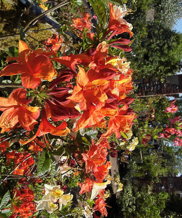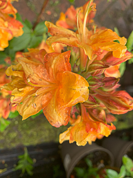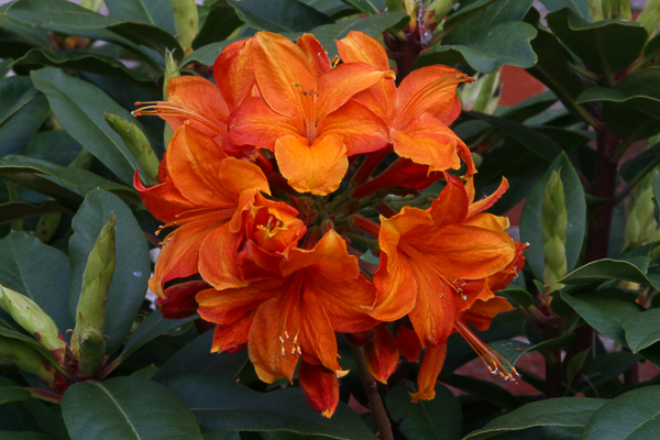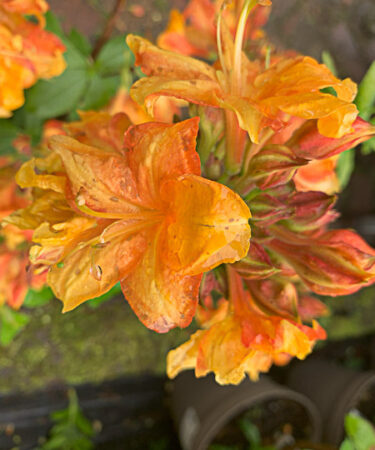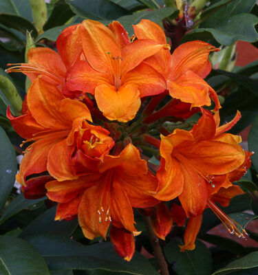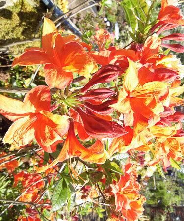 A spectacular Knaphill azalea. Large clusters of striking burnt orange trumpets with a vivid orange blotch. Flws: May-Jun. Ht 5-6ft. Rich crimson autumn colouring. Moist humus rich peaty soil, sun/part shade.