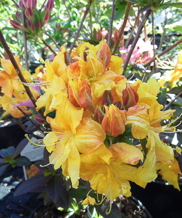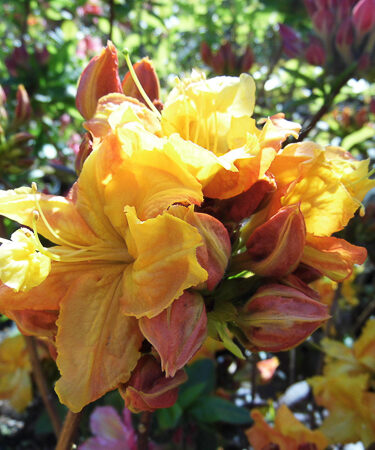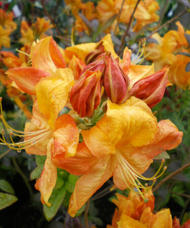 One of the most striking of the group. A beautiful large glowing orange-gold flws with red tints on the outside and flush red in bud. Young foliage coppery red. AGM 2002. Acid soil.