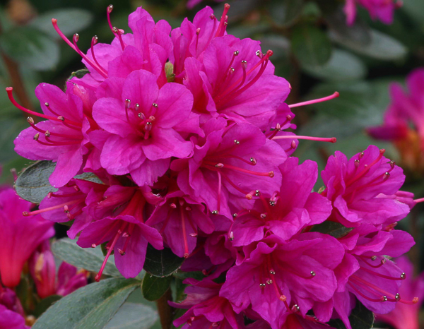 Evergreen azalea, with rose-pink to purple flowers. Well drained, peaty soil, part shade. 70cm height.