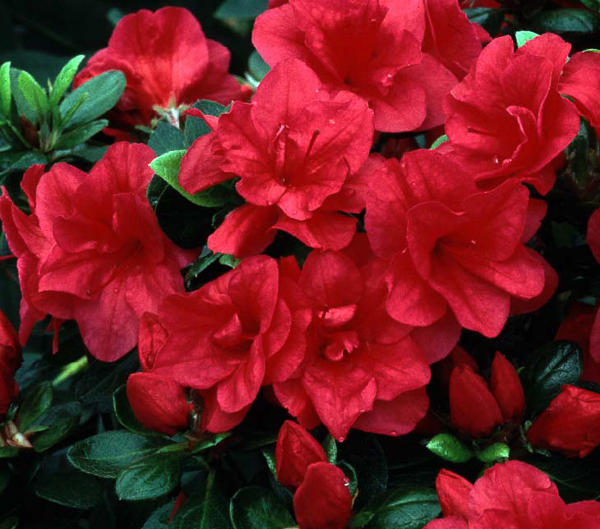 A japanese azalea producing red trumpet flowers, Apr-May. Evergreen. Small glossy dark green foliage. Ht 70cm. Well drained, peaty soil, part shade.