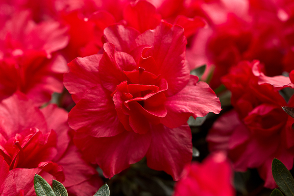 Attractive clusters of bright red double flowers in May, set off by deep green foliage on a neat compact growing plant. Hybrid between a double flowered indica, and a very hardy japonica. Ht 25-50cm in 10 years. Requires moist acid soil.. Moist acid soil, part shade. Protect from cold winds.