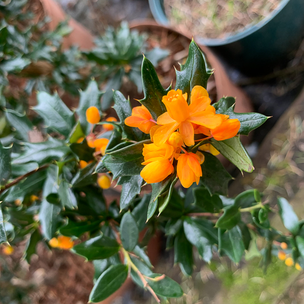 Berberis lologen ‘Apricot Queen’ AGM is a beautiful medium sized shrub. it has glossy evergreen leave with masses of rich apricot orange flws. Flws, Apr-May followed by shiny fruits. Ht 5ft. Well drained soil, sun or part shade. Spectacular spring shrub.