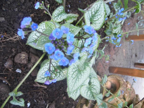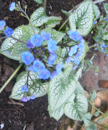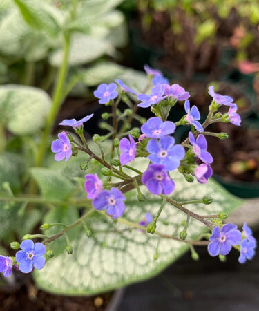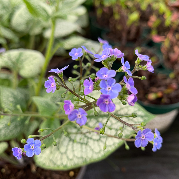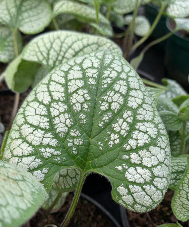 Clumps of thick, heart-shaped leaves that are green-on-silver with pronounced veining. Sprays of two-tone pink and blue Forget-me-not flowers, spring. Performs well in all but the driest of shady conditions. Excellent for the woodland garden. Provided there is sufficient moisture, plants can tolerate full sun; as the leaves are so thick, little or no scorching occurs.