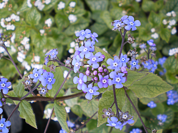 Excellent shade plant. Leaves large and irregularly spotted with many large silvery white spots. Blue flowers contrast nicely with the leaves.
