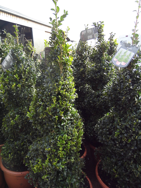‘Box’. Small dark green leaves. Slow growing. Clip into shape. Compact evergreen shrub. Ideal as a topiary specimen either in ground or in pot / urn. Any reasonable soil, sun / part shade.
