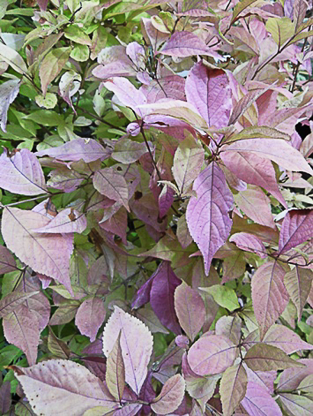An attractive, small shrub with oval leaves. Pale pink flowers followed by conspicuous violet fruits.