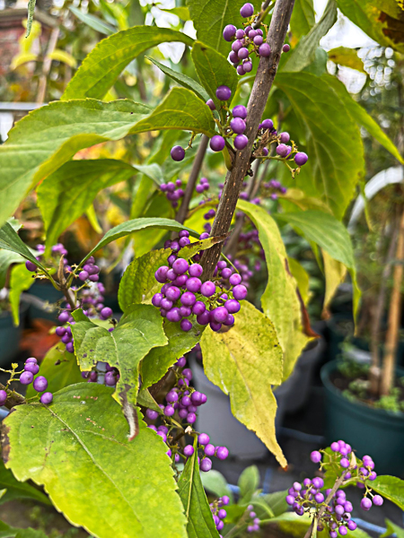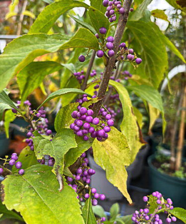 This delightful plant has mid-green, oval leaves and slender, arching stems along which blooms clusters of white/purple flower in late Spring/early Summer. These are followed by shiny, purple fruits that often persist into winter. Approx 1.2-2m (4-7ft). Well-drained soil and full/partial sun.